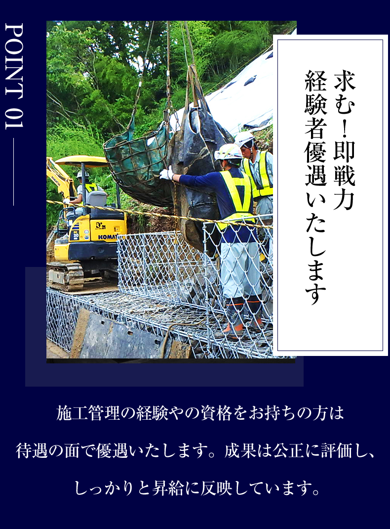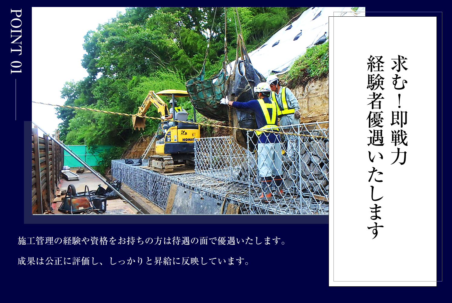 土木工事における外注管理や現場の施工管理、重機オペや現場作業に従事いただける方を募集しています。 現場は公共工事、高速道路の維持修繕や宅地造成など多岐に渡ります。 具体的な業務は、①施工計画・現場管理、材料発注、職人さんや発注者様との打ち合わせ、予算管理などの施工管理、②現場での重機オペを含む土木作業全般となります。(※①施工管理②土木作業員)