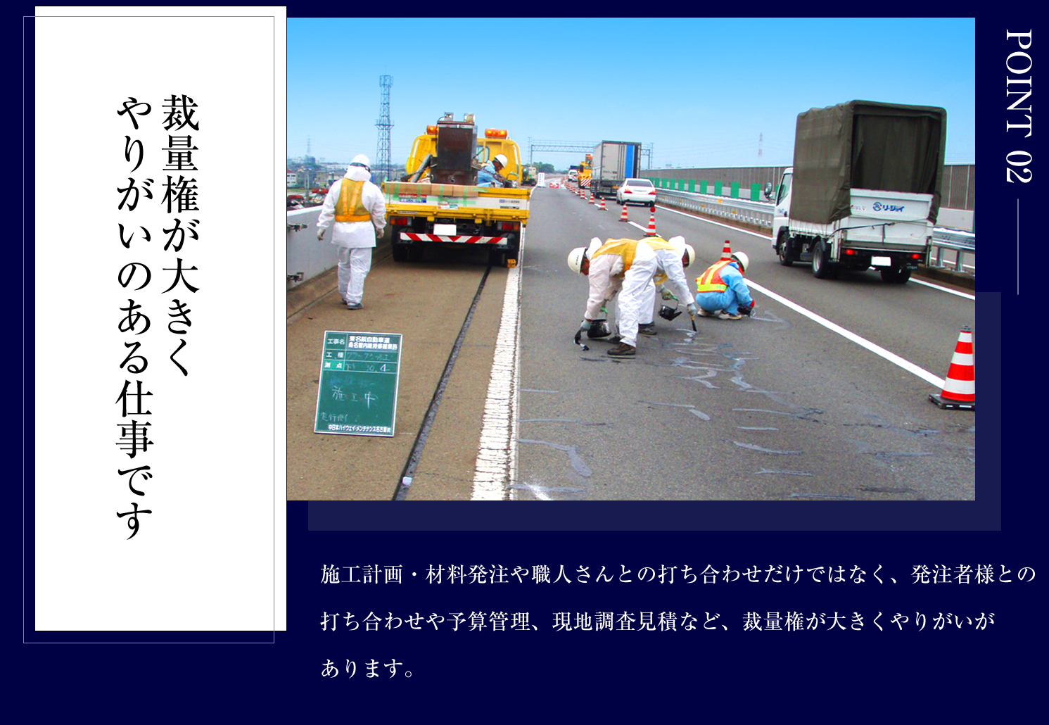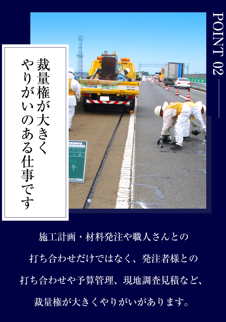 経験が浅い方や資格をお持ちでない方は、実務を通して先輩社員から学んでいただきます。経験豊富な方は、すぐに現場監督として活躍していただきます。